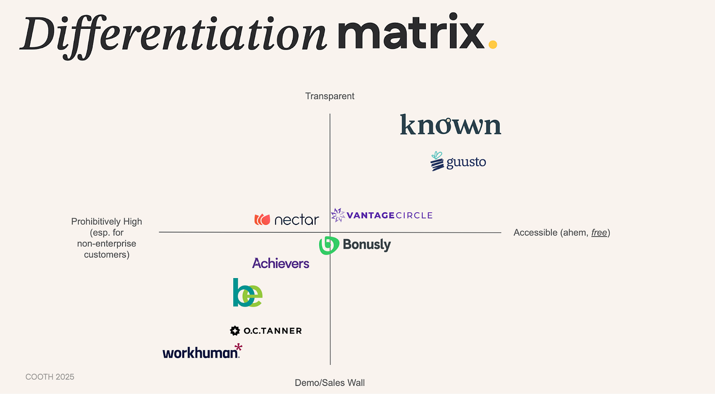 Client Savings: 20% turnover reduction. Knowwn's marketplace approach provides recognition capabilities with zero membership fees and avoids tariff impacts through US based sourcing. Recognition spend is more effective. In a space where up to 80% of wellness dollars go unspent Knowwn customers capture upwards of 95% of spend.